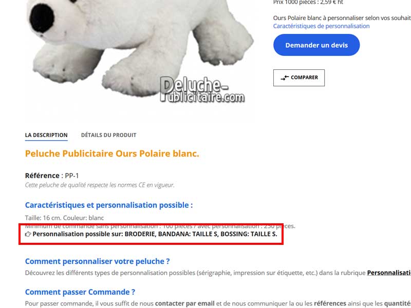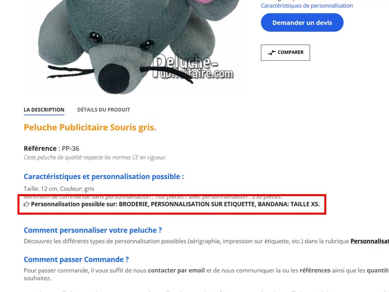 Sur chaque fiche produit est indiqué le ou les types de personnalisation qui peuvent être appliquées sur chaque peluche à personnaliser (exemple : broderie et étiquette).